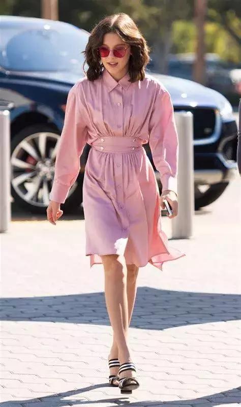 主演过《怪奇物语》,14岁的Millie Bobby Brown将粉色衬衫裙穿出了少女独有的甜美,尤其是腰间的腰带给造型加了不少分。