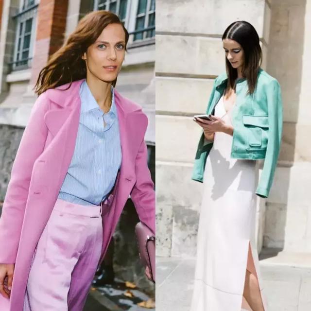 除了白灰等中性颜色,粉色与绿色,蓝色也是非常match的组合。夏季穿上清新的马卡龙色总会让人心情大好,空气感十足。