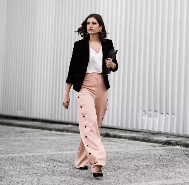 夏季到来,粉色直筒裤简直就是理想的出门伴侣,虽然颜色上比黑白要大胆另类些,但绝对值得尝试一番。大腿肉多的女生可以选择阔腿裤,既能藏肉,又能藏得住脚上的高跟鞋,显瘦又显高。