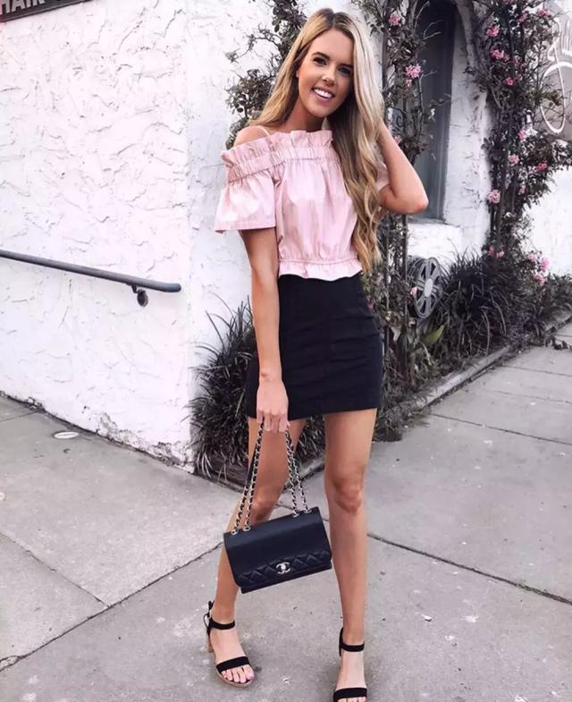 夏季必备的清凉一字肩可为我们带来很多好评,更不用说仙女粉款了。与一身All Black单品搭配,粉色也能瞬间让整个造型甜美洋溢起来。