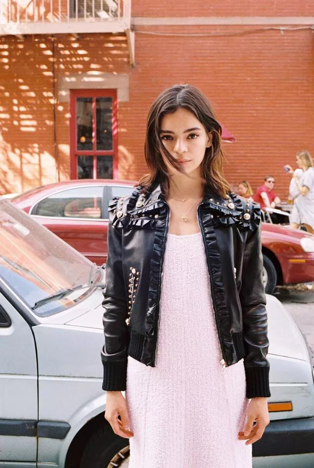 柔美浪漫的粉色裙,搭配一件硬朗率性的黑色leather jacket,耍酷的同时,还能显现出独立女性的都市摩登姿态。