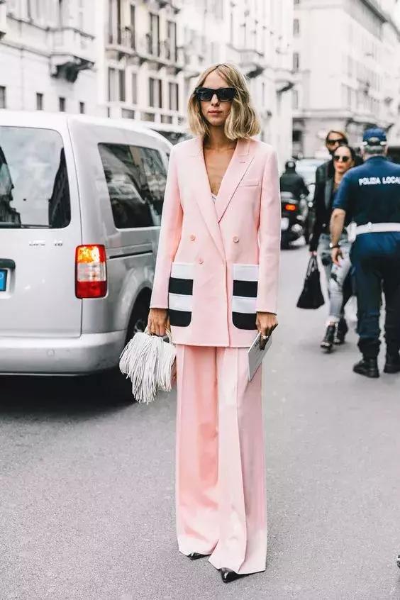 一般来说,oversize西装很容易给人一种咄咄逼人的印象,裸粉色即可在视觉上柔化廓形外套的强硬感,增加女性的柔美。
