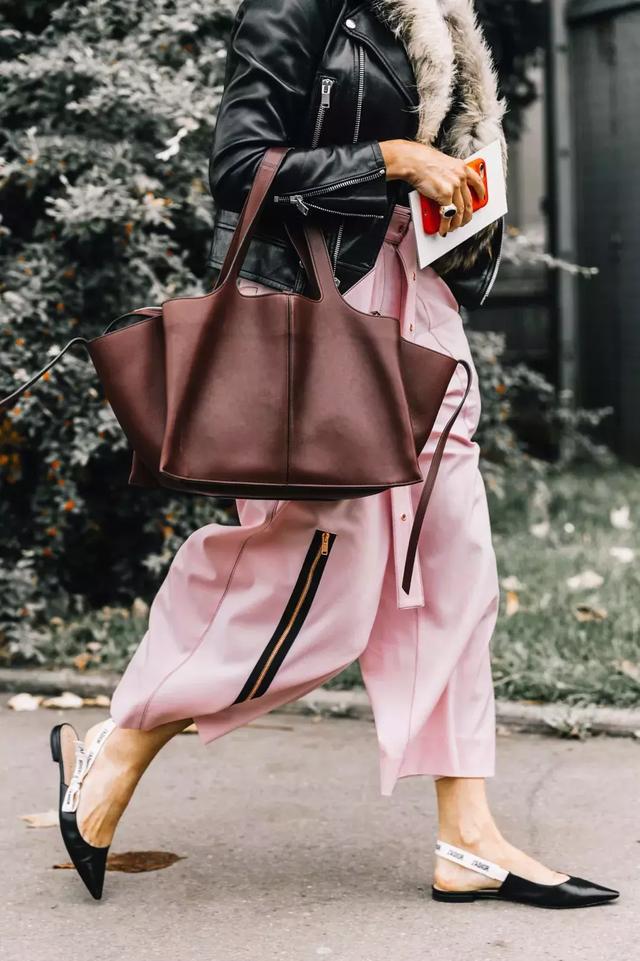 当阔腿裤长度与宽度比较尴尬时,拉链条纹等修饰物可转移视觉聚焦,让人更多记住了你小腿至脚部间的时髦。