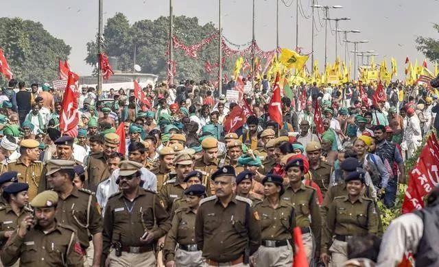 2018年末,5万多名印度农民在新德里示威,他们封锁道路,一路喊着口号,向印度国会“进军”。