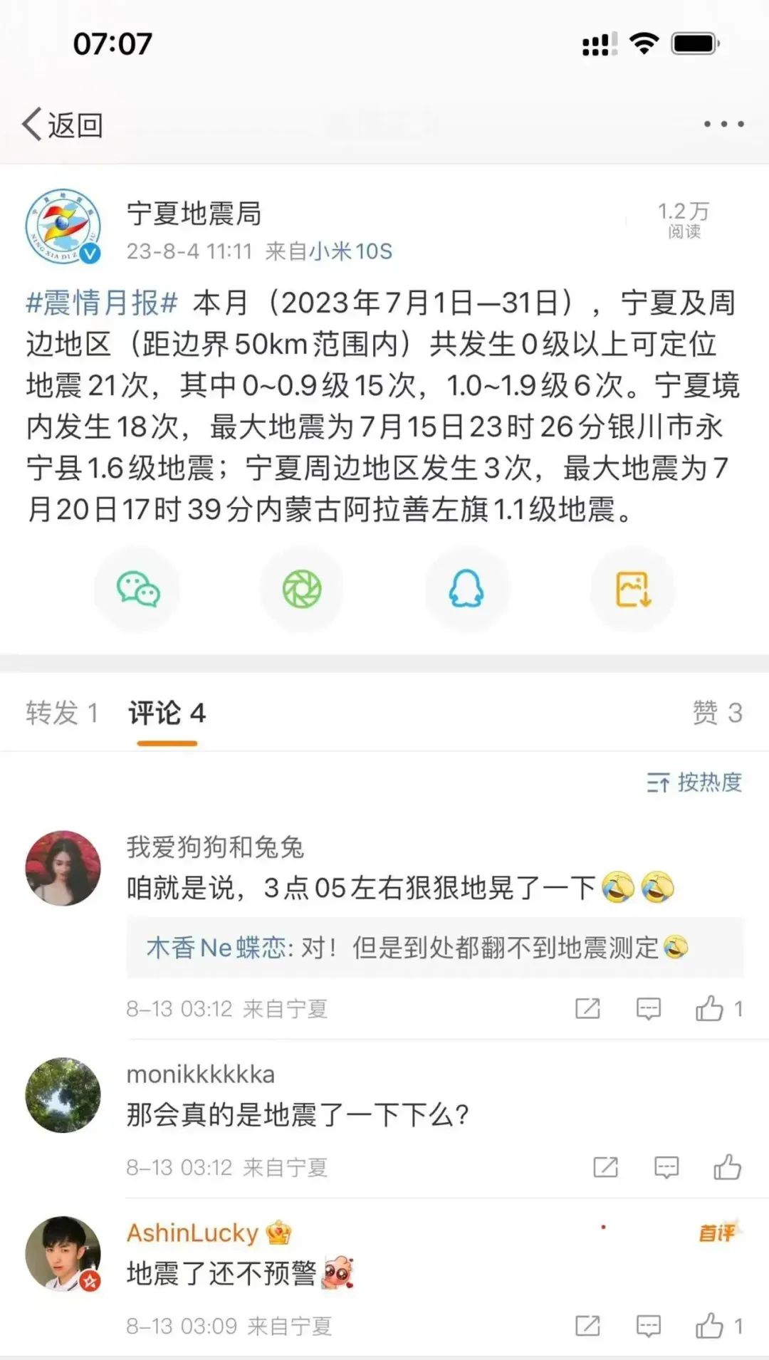 而在@宁夏地震局 的置顶微博下