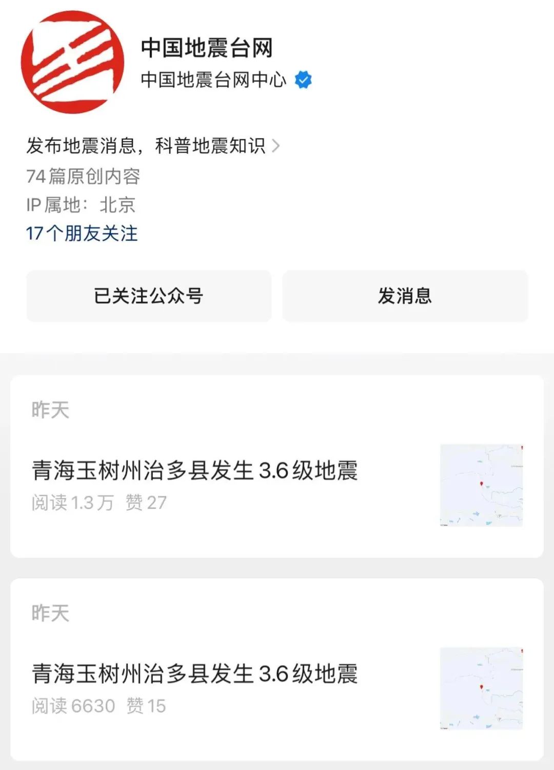 昨晚22时23分,中国地震台网正式测定:08月12日22时09分在青海玉树州治多县(北纬34.99度,东经89.66度)发生3.6级地震,震源深度10千米。
