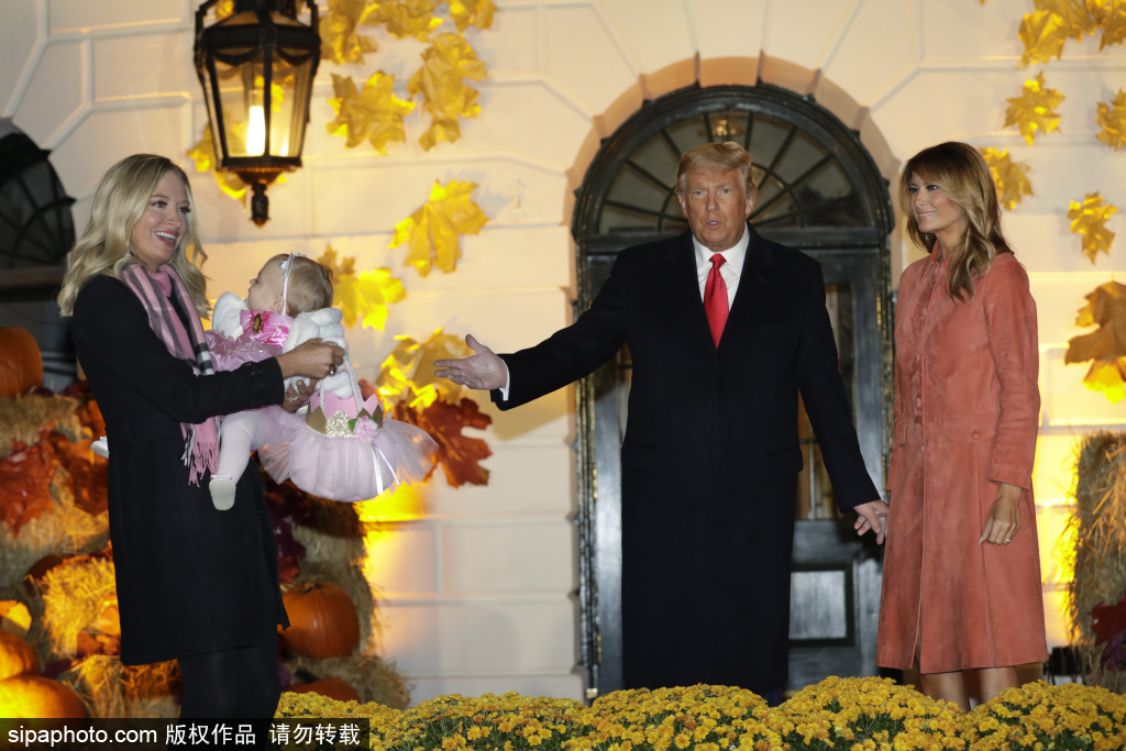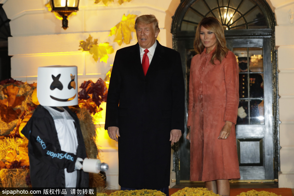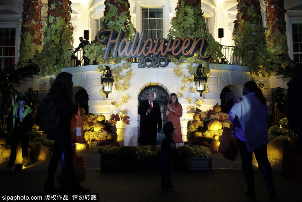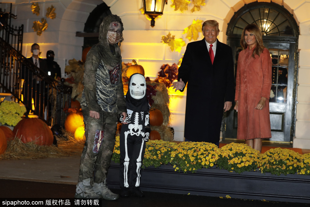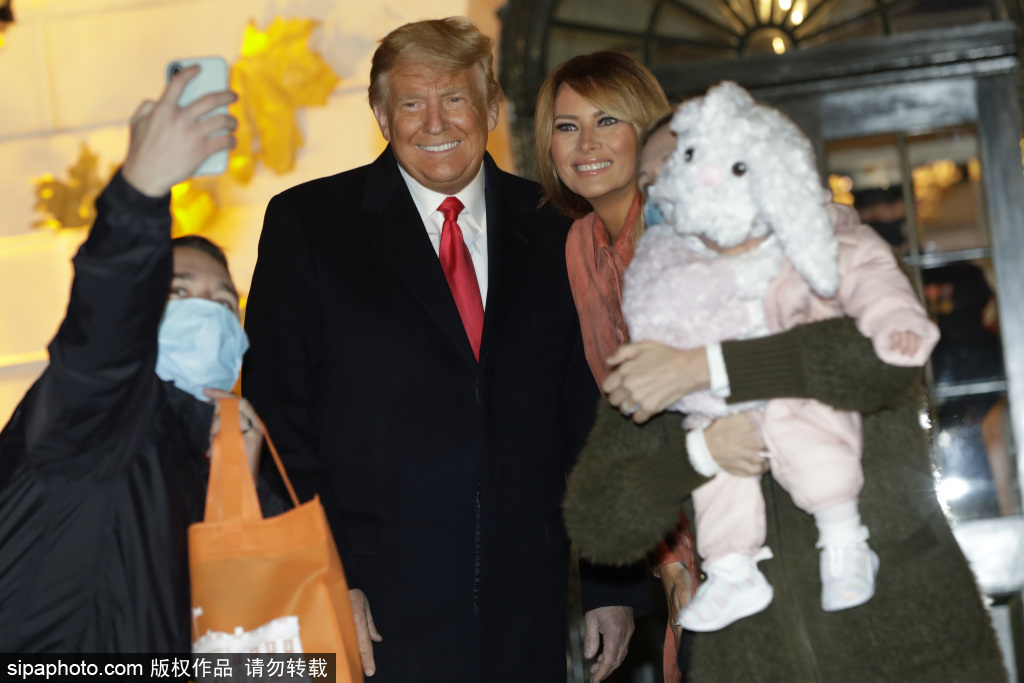 当地时间2020年10月25日,美国,特朗普和第一夫人梅拉尼娅在美国华盛顿特区白宫南草坪的万圣节活动中迎接孩子们。