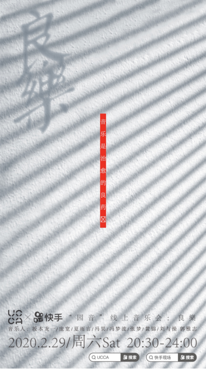 快手和UCCA将此次“园音”线上音乐活动的主题定为“良樂”,繁体字“藥”中可见,樂(乐)与藥(药)本同源,五音对五味,音乐与药物原本就有着天然的联系。这场以音乐为载体,以治愈为内核,意在为公众提供更好的情绪感受,更多的线上艺术体验。