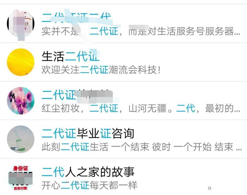 在聊天软件中搜索“二代证”,找到“二代证毕业证咨询”“二代二代”等公众号。