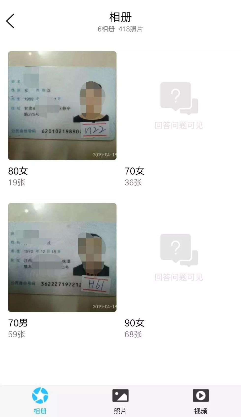 当记者提出“想要购买身份证注册公司”之后,对方让记者添加另一个名为“二代(空间挑选)”的QQ号,并提供相册密码给记者。在该QQ空间的相册中,建有“70后女”“80后女”“90后女”“70后男”“80后男”“90后男”6个相册,共有542张身份证的照片。这些身份证信息显示,身份证主人遍及全国各地,而浏览量达上千次。