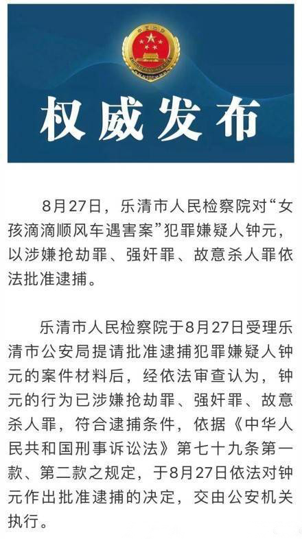 微信公众号“乐清市人民检察院”8月27日消息, 8月27日,乐清市人民检察院对“女孩滴滴顺风车遇害案”犯罪嫌疑人钟元,以涉嫌抢劫罪、强奸罪、故意杀人罪依法批准逮捕。