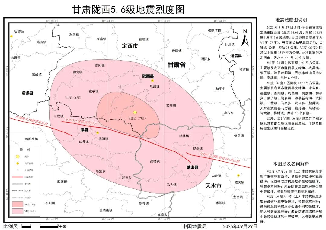 2025年9月27日5时49分,在甘肃定西市陇西县发生5.6级地震。地震发生后,中国地震局派出地震现场工作队,依照《地震现场工作:调查规范》(GB/T 18208.3-2011)、《中国地震烈度表》(GB/T 17742-2020),对灾区212个调查点展开实地震害调查,并充分参考震区断裂构造、仪器烈度、余震分布、震源机制等科技支撑成果,确定此次地震的烈度分布,完成《甘肃陇西5.6级地震烈度图》编制工作,现正式向社会发布。