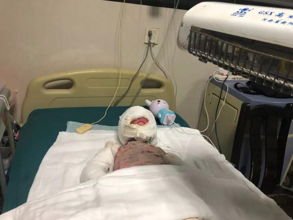 裹满纱布的小小身躯躺卧在病床上,头脸部唯一从纱布中露出来的孩子的雪白牙齿特别显眼——脸部瘢痕挛缩让他无法闭上嘴唇,蒙在纱布之下的眼睑也一样,只有微微起伏的胸腹显示他仍在顽强呼吸。