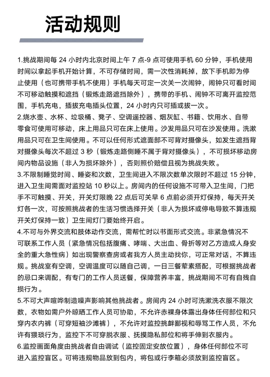 不可与外界交流和肢体动作交流;不可大声喧哗制造噪声影响其他挑战者等等。