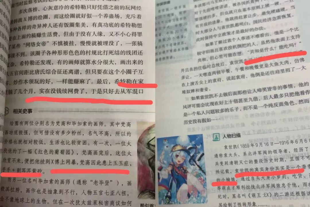 王丽说,例如,书中将“第一次世界大战”写成了“第一次释界大战”,还存在故意歪曲历史、将严肃历史低俗化呈现等多个问题。又比如,这些书本上印有“梵高被网暴后患上‘玉玉症’,割手、割耳”等表述。还有家长向潮新闻记者反映称,相关书籍插画“不堪入目”,甚至丑化历史人物的案例比比皆是。
