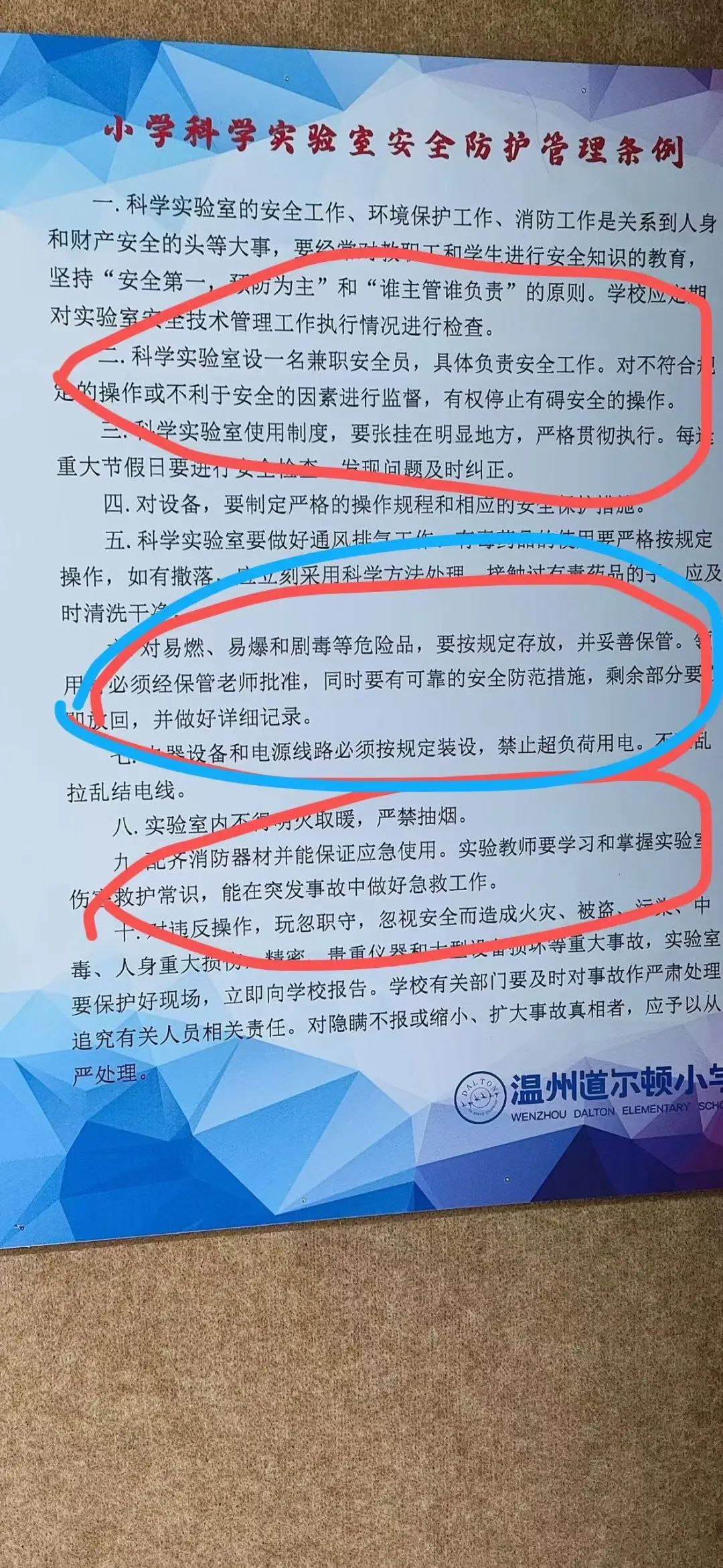 事后,诸先生一家曾到实验室查看,在他们看来,校方并未完全遵守实验室内张贴的《小学科学实验室安全防护管理条例》,没有严格执行实验操作规范。“例如,条例要求设兼职安全员负责安全,但事发时仅执教老师一人在场,难以全面顾及所有学生。对易燃、易爆和剧毒等危险品,没有可靠的安全防范措施。”
