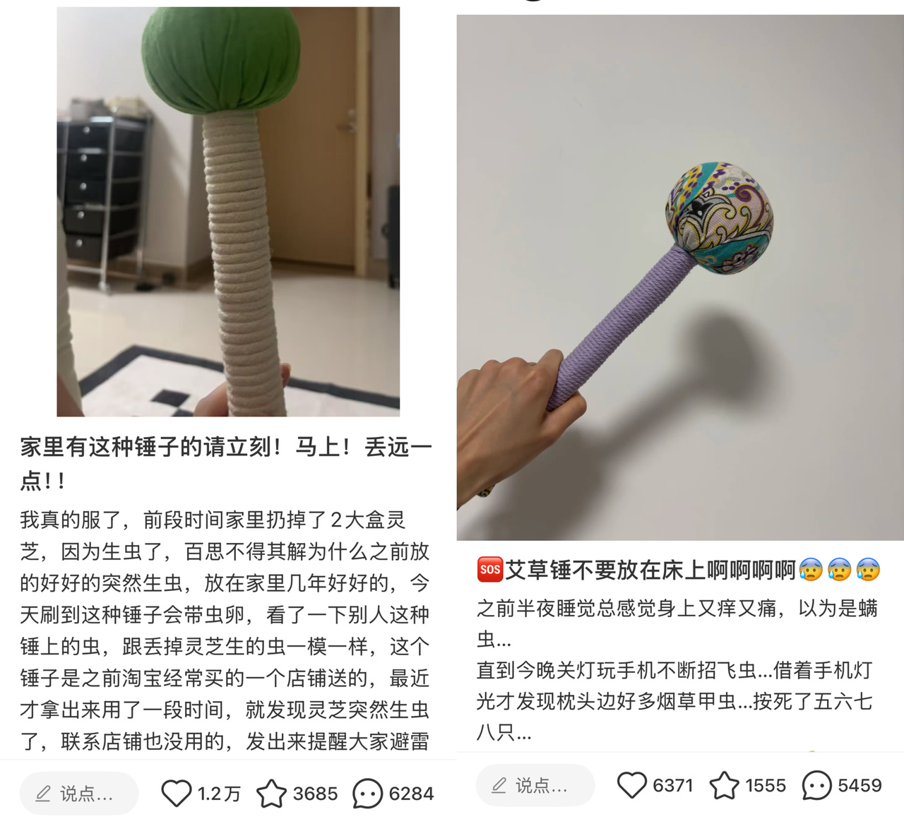 张女士告诉记者,根据网友们的经验,她追溯源头把家中那把买来一年多的艾草锤列为了重点怀疑对象。“学着网友的方法,用密封袋套住艾草锤做实验,三天后果然发现了它们的踪影。平时拿艾草锤用来敲敲打打,感觉还挺养生的,没想到居然成了这些小虫子的‘繁殖基地’了。”