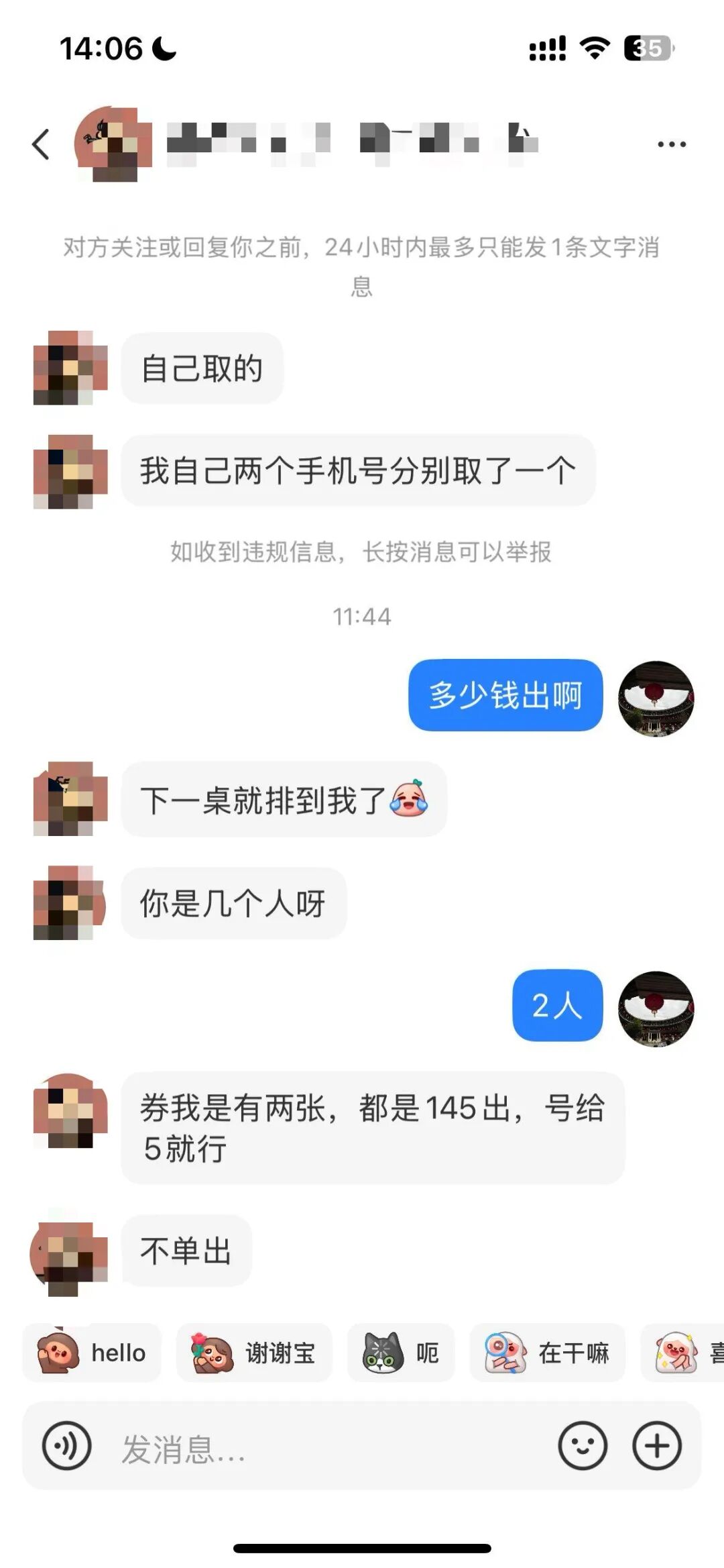 “1~2人的小桌号,还剩5桌排到,预计12:30前可进,券需在12:46前使用。”网友@香草正在出售杭州丁桥某网红日料店的号子和代金券,他告诉记者,因为自己刚好要到这家餐厅用餐,便用另一个手机号码多取了一个号,还用消费券购买了卡券。