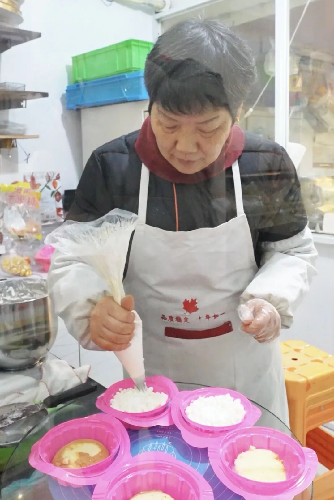 穿戴着“品质稳定,十年如一”经营初心字眼的围裙,店主徐水萍正忙碌着打发奶油,不大的店面里,干净的橱窗,各种充满年代特色的蛋糕、面包产品琳琅满目。