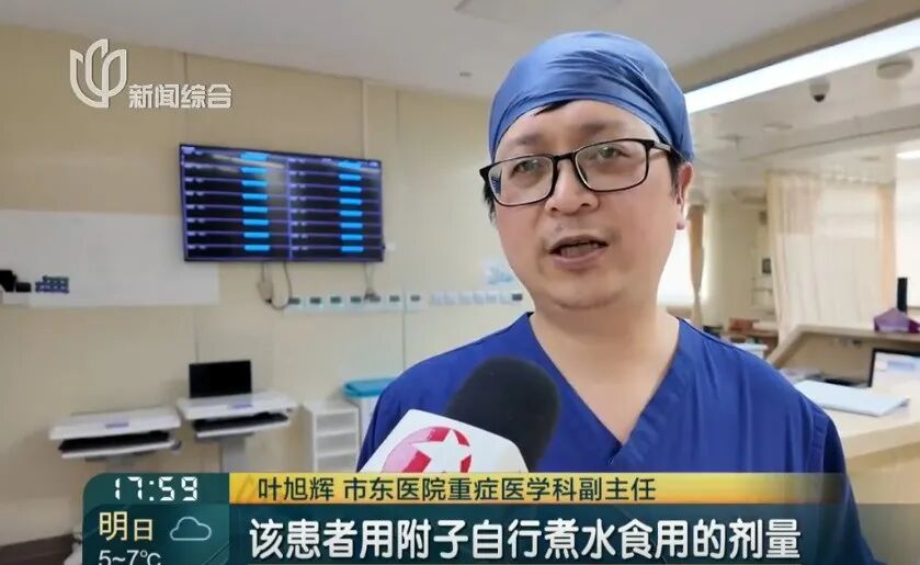 上海市东医院重症医学科副主任叶旭辉介绍,该患者用附子自行煮水食用的剂量,已经超过了正常的安全剂量,而且煮沸的时间还不足(患者实际是用热水泡的),所以导致了他急性中毒,随后出现了严重的呼吸心跳骤停。
