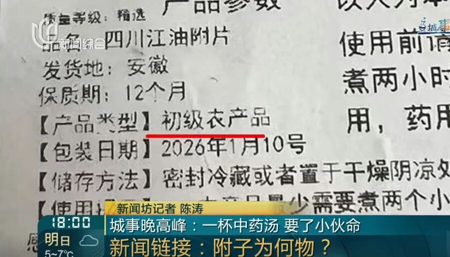 记者发现,夏先生购买的这包“四川江油附片”,外包装上产品类型标注的是“初级农产品”,因为附子本身是乌头植物的块根,地里采收的鲜附子,可以作为初级农产品进行交易,但它并不是可以直接用于临床的药品,必须经过一系列复杂、规范的炮制加工,将其毒性降低到安全范围,才能成为“中药饮片”。