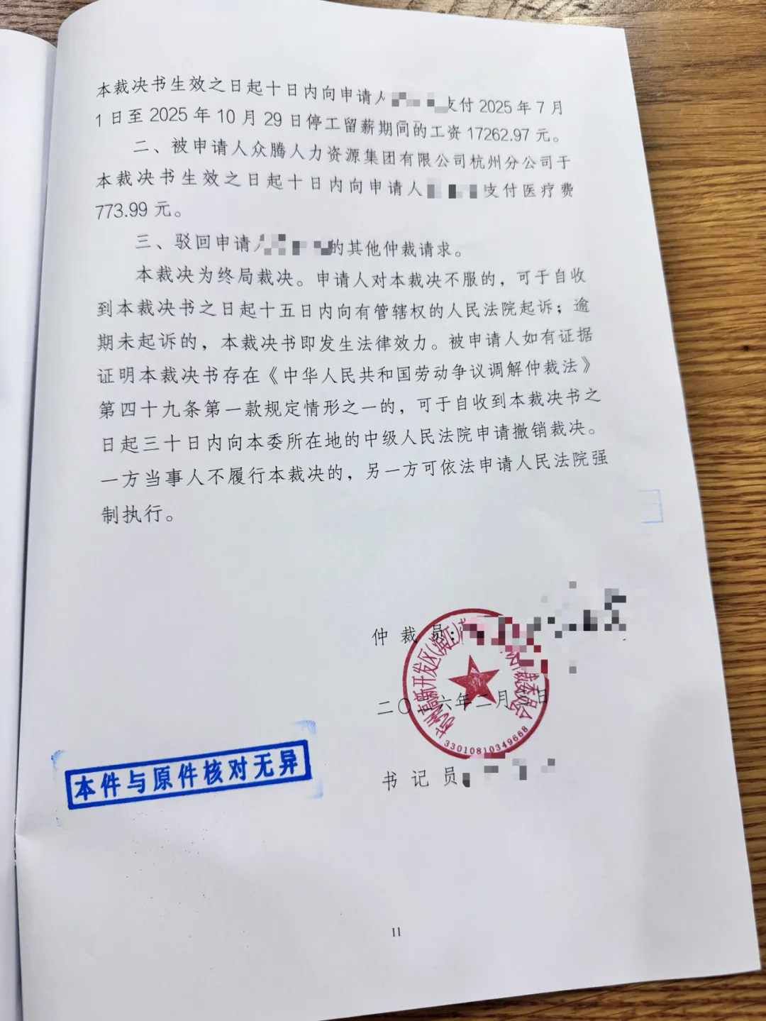 该案于1月23日在所在地劳动人事争议仲裁委员会开庭审理。根据魏莹提供的仲裁裁决书,仲裁委裁定众腾公司需赔偿魏莹2025年7月1日至10月29日期间的停工留薪工资17262.97元,以及申请工伤认定前的医疗费773.99元。
