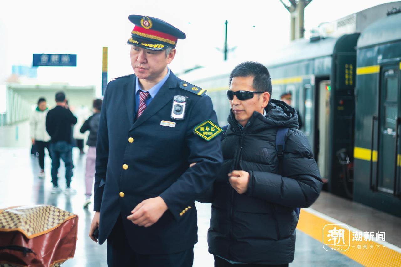 列车长李铭扶着盲人下车。谢春晖/摄