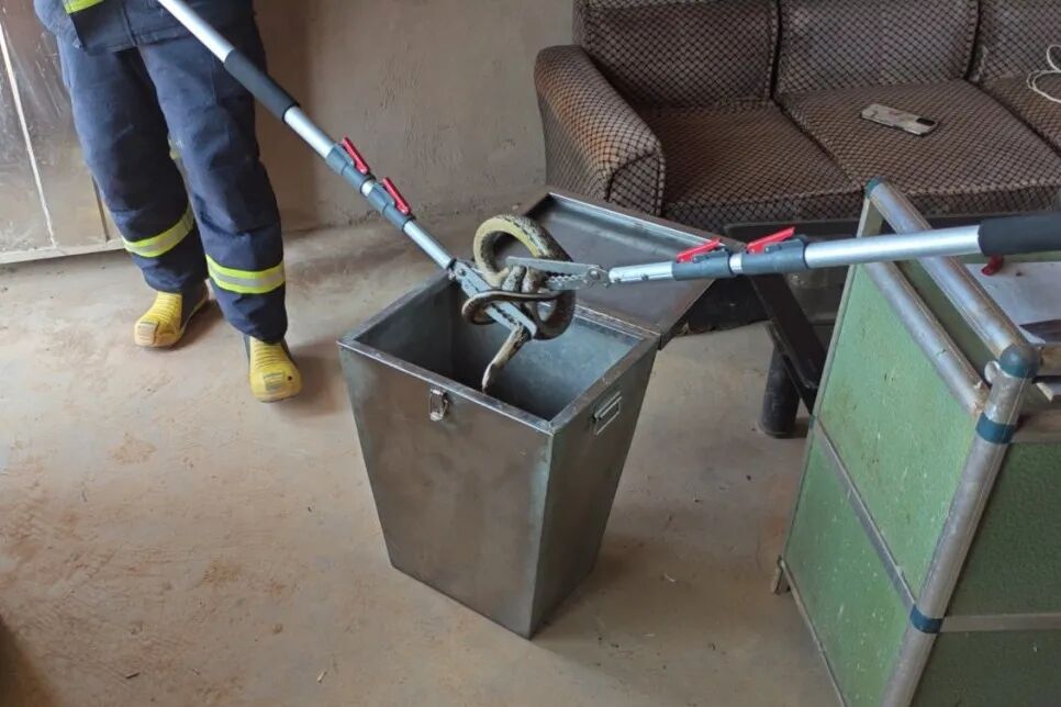 消防员看准时机,使用捕蛇器,牢牢控制住其中两条蟒蛇,将它们装入收纳袋中。