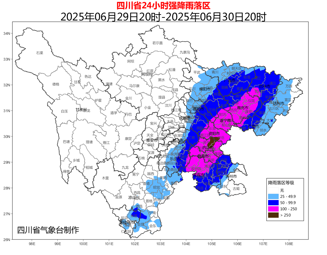 6月29日20时到30日20时:巴中、南充、遂宁、资阳、内江、自贡、宜宾7市,广元、绵阳、德阳、成都、眉山、乐山6市东部,达州、广安2市西部,泸州北部有暴雨到大暴雨(雨量70~150毫米),个别地方特大暴雨(雨量280~330毫米),最大小时雨强70~90毫米,强降水时伴有雷电和阵性大风。另外,攀西地区东部南部有大雨到暴雨(40~70毫米)。