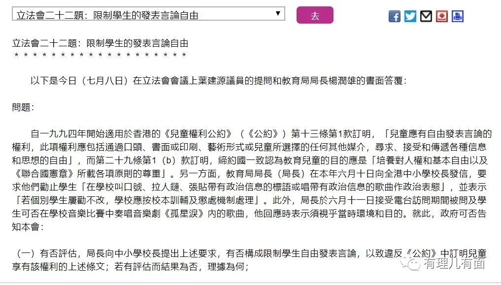 7月8日,反对派立法会议员、卖港“黄师”叶建源在立法会会议上试图以教育局“限制学生的发表言论自由”为由,为学生争取“自由表达政见”、“在校园喊口号、张贴带有政治信息的标语或唱带有政治信息的歌曲做政治表态”的权利。对于其提出的种种歪理邪说,教育局局长杨润雄在书面答复中一一进行了有力驳斥。