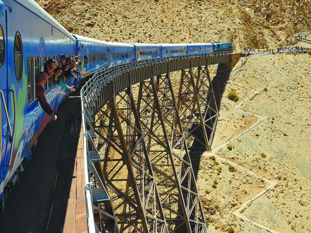 在阿根廷斯拉塔省,有列“云中列车”,横穿阿根廷西北部,从海拔1800 米的萨尔塔市出发,并通过海拔超过 4000 米的波沃里利亚高架桥,最终到达了安第斯山脉的阿塔卡玛高原。两三千米的落差,让这列火车在行驶中看上去很惊险。