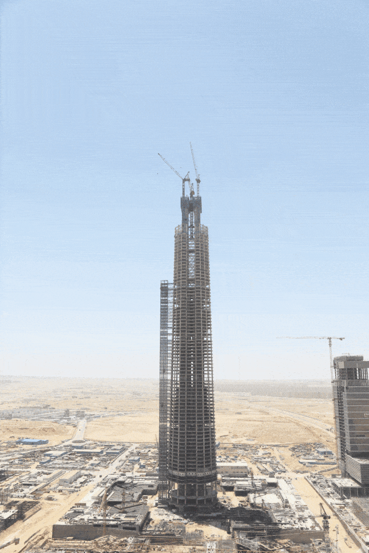 从开罗市中心驱车东行约50公里,《环球时报》记者来到总占地面积约50.5万平方米的埃及新行政首都中央商务区(CBD)。驶过一大片黄色戈壁,当离最高点385.8米的“非洲第一高楼”——标志塔越来越近时,那种逼人的视觉冲击感就越来越强烈。这座地上建有78层的高楼是一个集办公、酒店、商业、观光等功能于一体的复合业态超高层建筑,由中国建筑股份有限公司埃及分公司(中建埃及)承建。今年6月标志塔封顶,成为中国与埃及“一带一路”建设的旗舰项目。