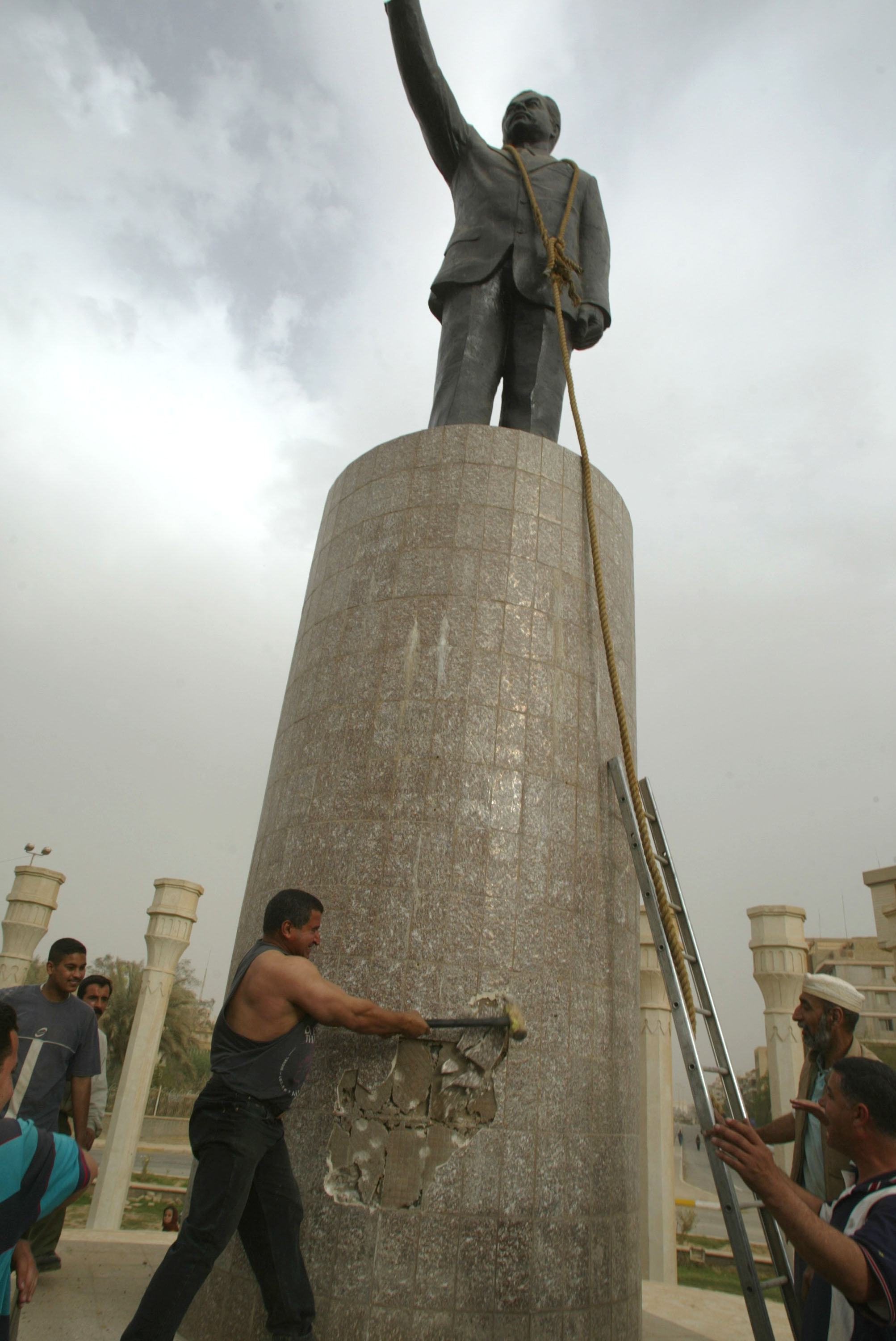照片中挥舞铁锤的伊拉克男子名叫贾布里,在巴格达当地经营着一家摩托车修理行。他曾经是一名举重运动员,据称贾布里曾因得罪萨达姆的儿子而坐了11年牢,因此他对萨达姆政权非常痛恨。2003年4月9日,在胜利广场,包括贾布里在内的一些伊拉克人挥锤砸雕像的影像被各国媒体记录了下来。但铁锤仅损毁了雕像基座表层很小一部分。此时,一直旁观的美军出手了。美军一辆带起重设备的装甲车早就在现场停着,美军士兵将钢索套在雕像的脖子上,随着装甲车启动,重达一吨的雕像终于倒掉了。