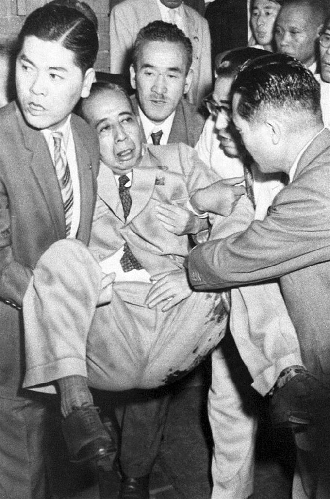 1960年7月14日,首相官邸举行自民党新总裁池田勇人的就任招待活动,岸信介从会场走出来时,被忽然出现的65岁右翼分子袭击,登山刀刺到了他的左腿上,顿时血流如注。当时现场一片混乱,遇刺后的岸信介被紧急送往医院(如图),并无性命之忧。刺杀者荒牧退助当场被抓,被押送到了警察局。在供述刺杀岸信介的原因时,荒牧退助称:“我这么做是为了敦促他反省。”
