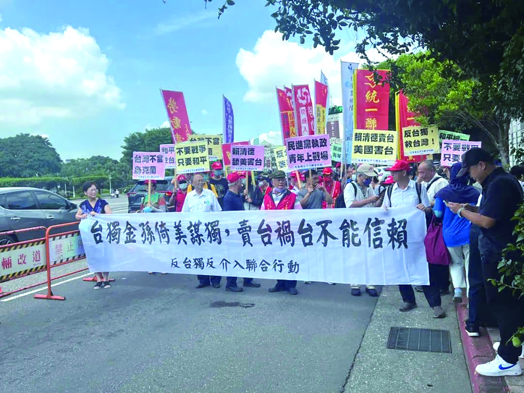 11日上午,由60多个政党和团体共同组成的反“台独”反介入联合行动动员600多人走上蔡英文办公室前的凯达格兰大道抗议赖清德“过境”美国,配合美国的“毁台计划”,将台湾带入战争危机,并诉求重回两岸同属一个中国的“九二共识”,以维护台海的和平安全。