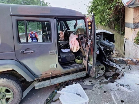 12日晚间6时许,有军车在通过高雄市旗山区旗南三路时发生冲撞(如图),车上3名官兵受伤被撞得头破血流,被救出车外时倒地,车内更是一片凌乱的“血染安全气囊”,所幸3人皆无生命危险。