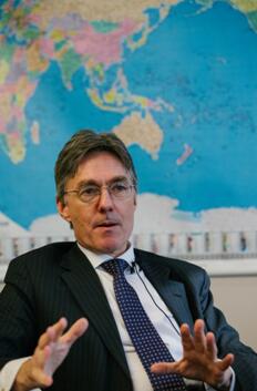亚投行负责运营政策与战略事务的德国籍副行长冯·阿姆斯贝格博士在亚投行北京总部接受《环球时报》记者专访。李昊摄