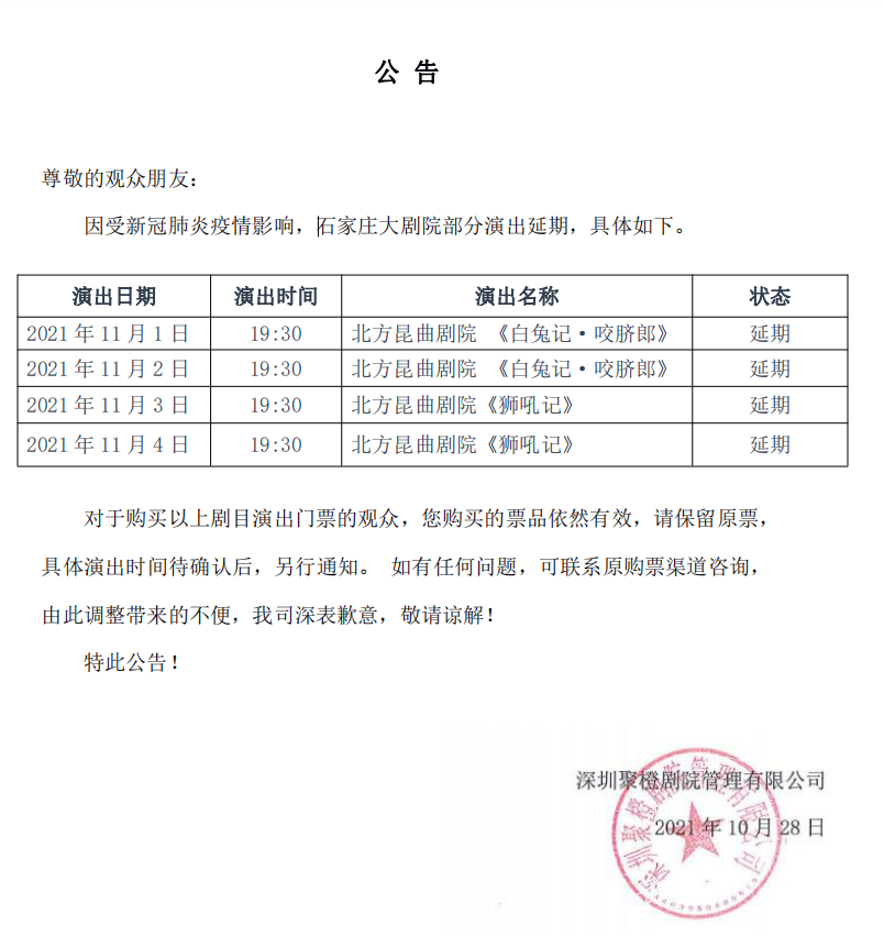 ·2021年11月3日-4日19:30在石家庄大剧院大剧场北方昆剧院《狮吼记》,共2场,演出延期