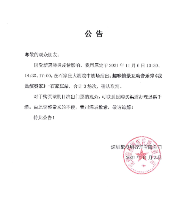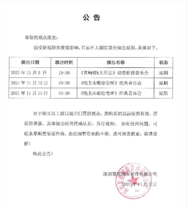给您带来的不便,敬请谅解!再次感谢您对石家庄大剧院的理解和支持。
