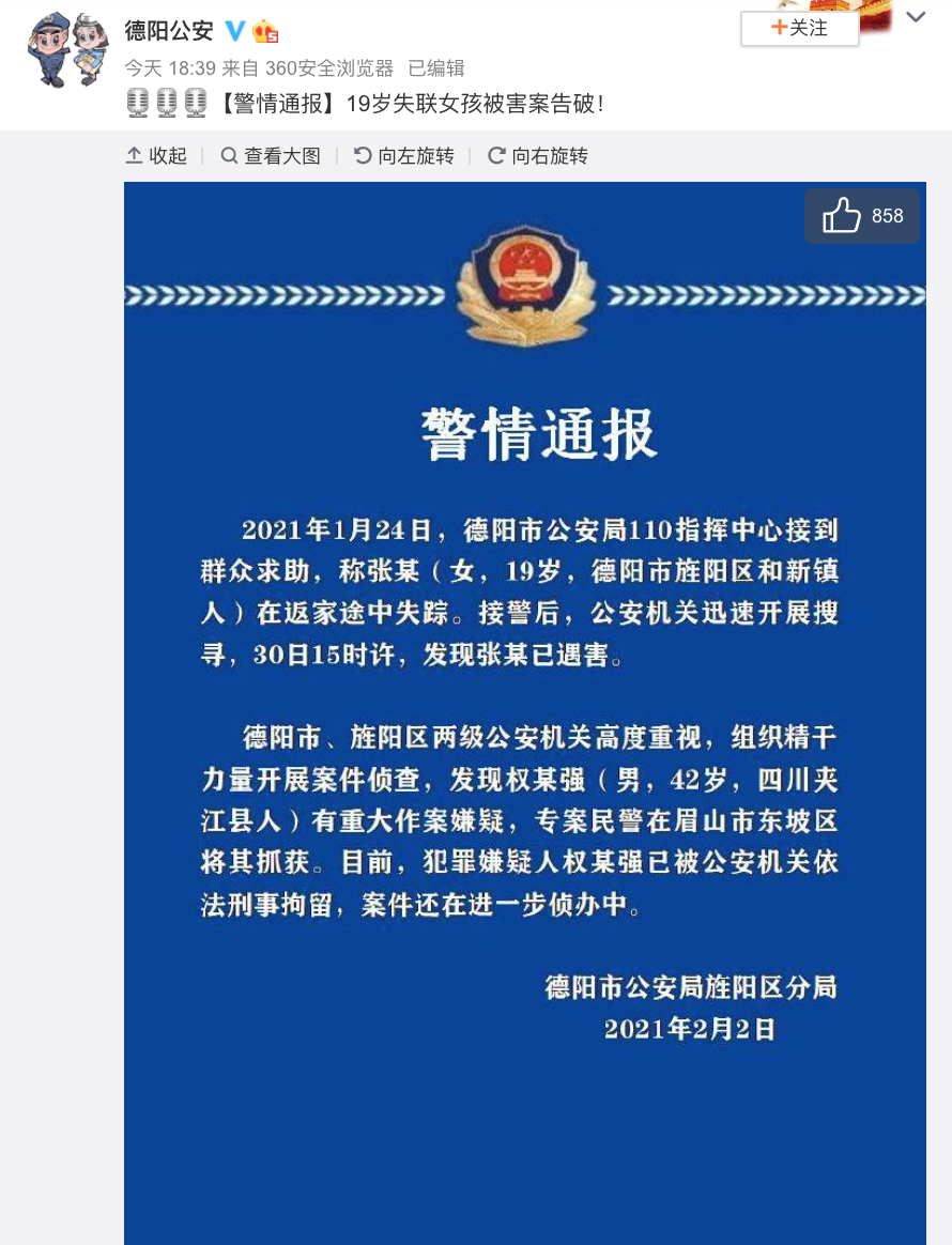 近日,19岁失联女生被害一事引发关注。2月2日,@德阳公安 通报,“19岁失联女孩被害案”告破,嫌犯已被刑拘。