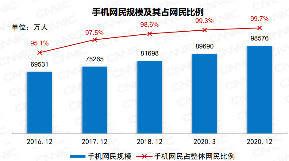 其中,手机网民规模达9.86 亿,较2020年3月增长8885万,网民使用手机上网的比例达 99.7%,较 2020年 3月提升 0.4个百分点。