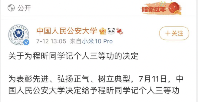为表彰先进、树立典型,根据《中国人民公安大学奖励工作办法》《中国人民公安大学本科学生奖励规定》《中国人民公安大学学生专项表彰奖励评选条件和标准规定》有关精神,经学校研究,决定为程昕同学记个人三等功一次。