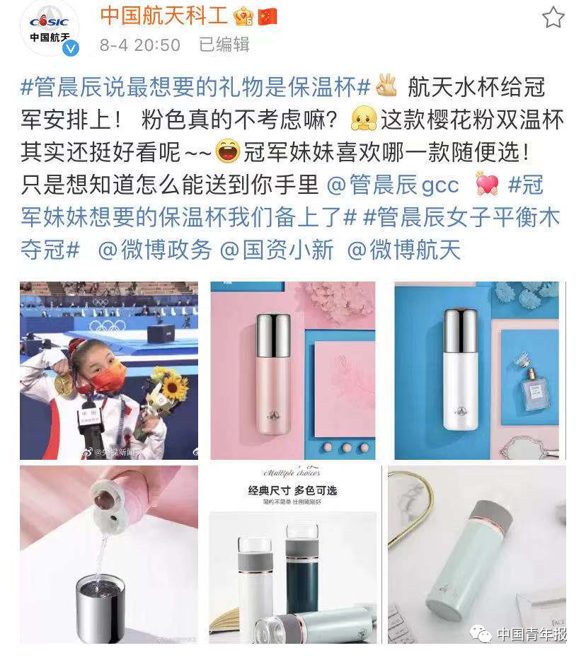 此外,管晨辰要求保温杯“不是粉色”, @中国航天科工 强行安利樱花粉!网友:粉色的我们收下就行了。