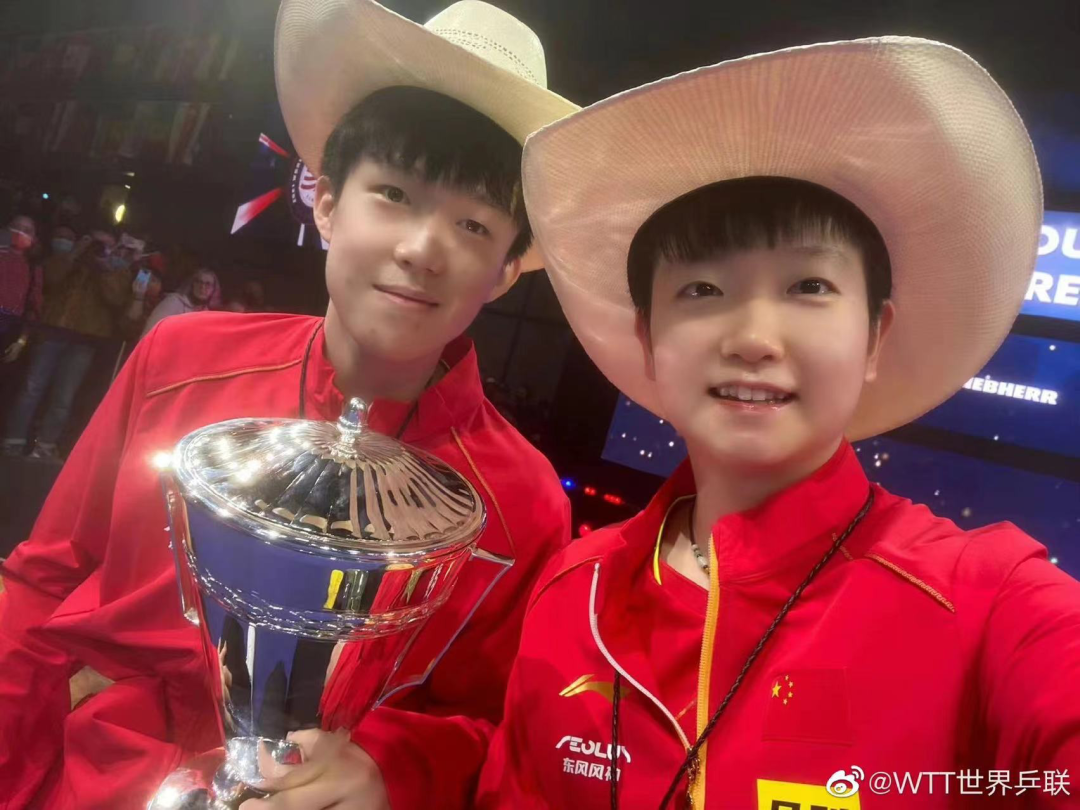 刚刚,2021休斯敦世乒赛在混双赛场产生第一枚金牌, 中国队“00后”组合 王楚钦/孙颖莎以3比0击败日本队 张本智和/早田希娜,首度捧得世乒赛混双冠军奖杯赫杜塞克杯。
