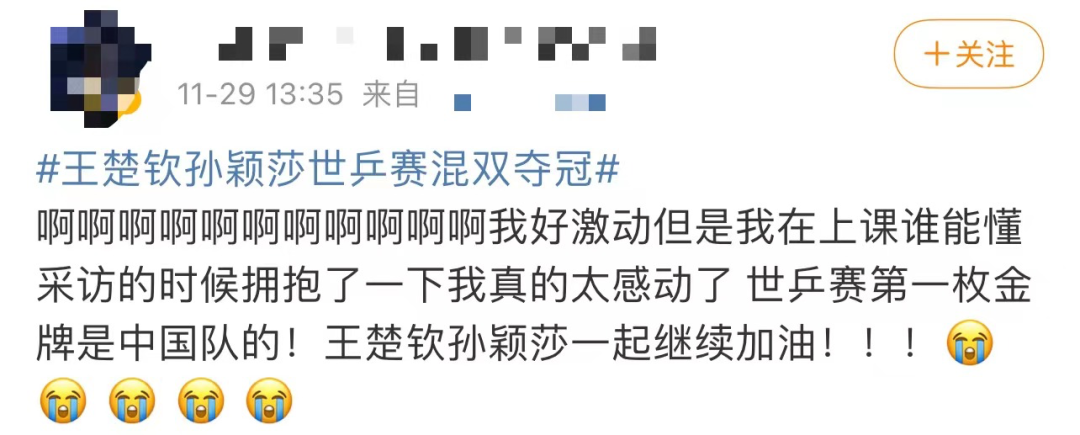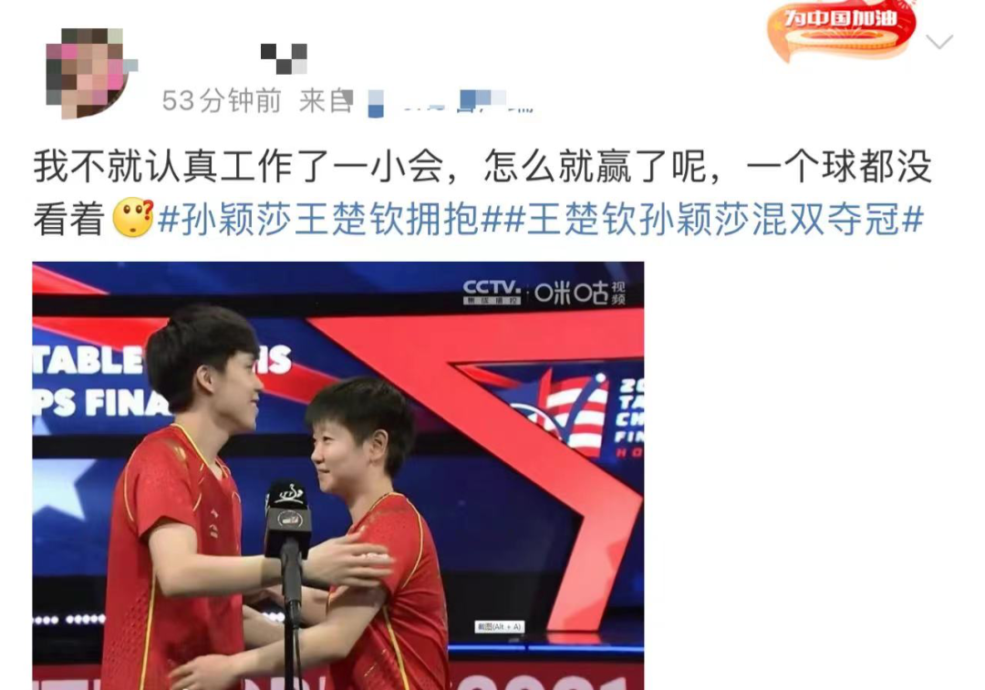 “我们拥抱了一下!”王楚钦孙颖莎庆祝世乒赛夺金,网友:我饭还没吃完......