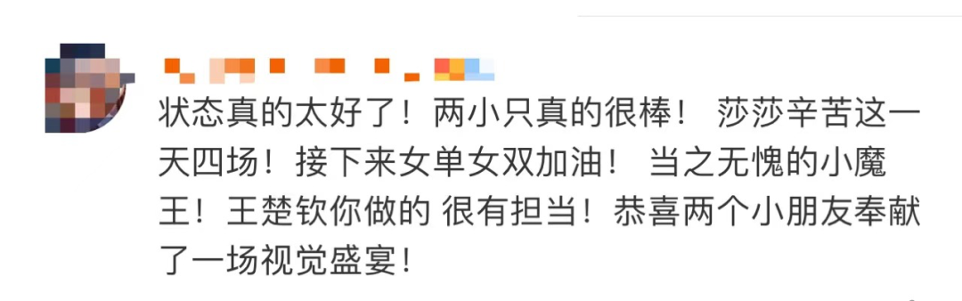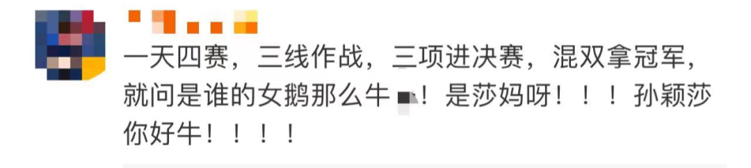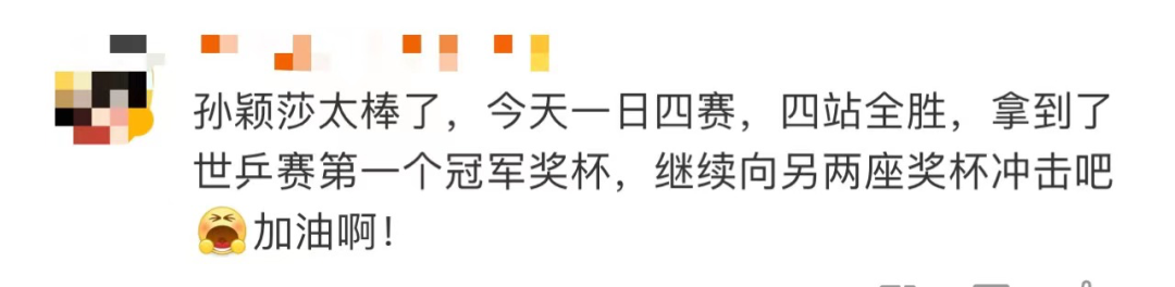 值得一提的是,过去12个小时内, 孙颖莎接连参加了混双半决赛、女双半决赛、女单半决赛和混双决赛4场比赛,豪取一拨4连胜。