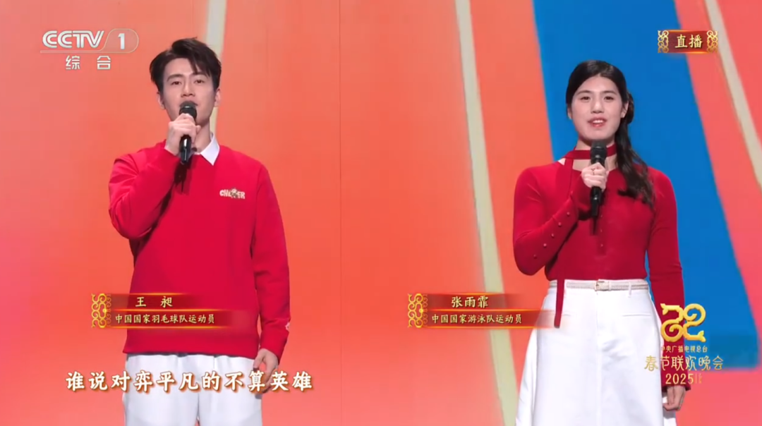 从巴黎奥运到春晚舞台!春晚现场,张雨霏终于跟陈奕迅合唱了《孤勇者》,还有曹缘、刘宇坤、邹敬园、辜海燕、冯雨、李雯雯、王昶、伍鹏、邓雅文。