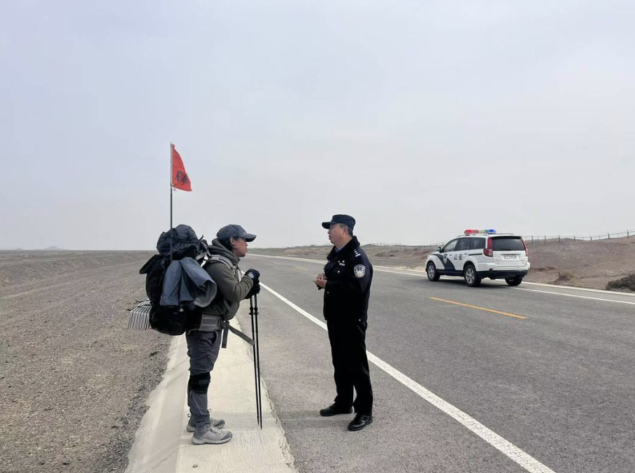 民警再次对他进行了劝导,文雷当即表示严格遵守相关规定,把个人安全放在首位。在确保文雷食物、饮水充足,身体状况良好的情况下,民警同意他继续沿着玉雅公路徒步,并约定在40公里外的雅丹公安检查站(也就是雅丹派出所)碰面。