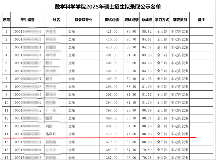 发布于今年4月3日的《数学科学学院2025年硕士招生拟录取公示名单》显示,该名单序号第14为匙凯歌,拟录取专业为金融,学习方式是全日制,非定向就业。