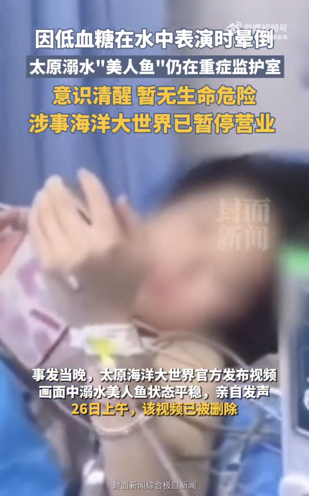 26日,上述晕倒“美人鱼”表演者家属表示,“美人鱼”意识清醒,有胸闷症状,不过因为呛了水,可能引发肺部感染,仍在重症监护室,需做进一步观察。而涉事的太原海洋大世界官方抖音账号删除了25日晚“美人鱼”醒后发声的视频。